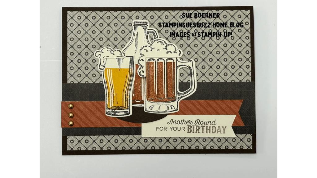 My card features the Brewed For You Bundle (#159093)! It is one of the first bundles I bought from this annual catalog. The card base is Early Espresso with a layer of He’s The Man DSP (#159068). I added a 2″ strip and a 1″ strip from the same DSP pack. The beer glasses and jug were stamped in Memento Black on Very Vanilla. Cajun Craze and Crushed Curry filled them up! The glasses sit on an oval of Early Espresso punched with the Double Oval Punch (#154242). The sentiment was stamped in Early Espresso on a scrap of Very Vanilla and the end punched with the Banners Pick a Punch (#153608). Three gold Brushed Metallic Adhesive Backed Dots (#156506) complete my card.